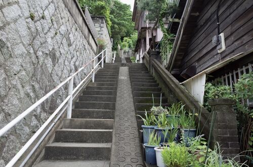 門司区 庄司町の階段巡り。かつて城があったという東明寺山の急斜面に建つ民家と、その周りの階段。眺望の良い立地にそびえる邸宅の前で、不思議なものを見つけた。