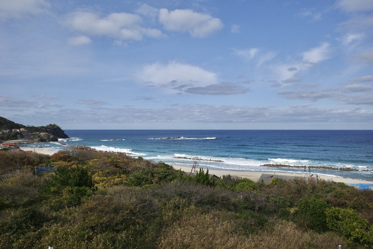 駐車場からは日本海を望む。海沿いを山陰本線も通っており、海を背景に電車を撮られる方も多いのだとか。