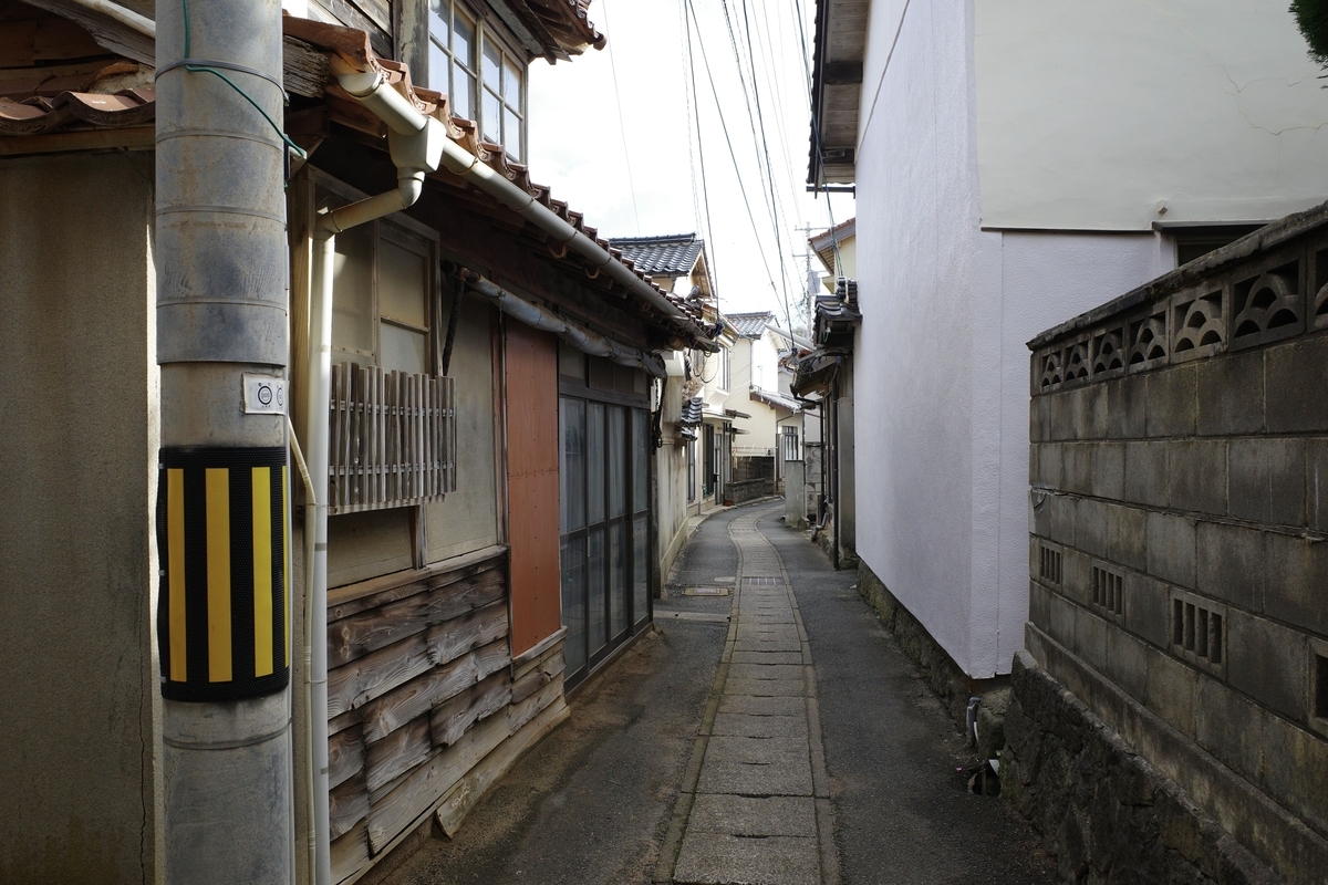 港町らしく家屋の密集度が高い。家々の間を縫うように路地が形成される。